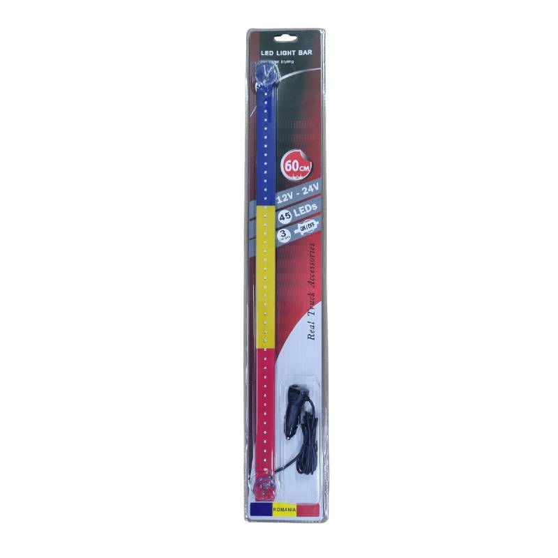 Bandă led luminoasă 60 cm, în culorile României. Funcționează la 12V și 24V și se conectează direct la priza auto prin mufă tip brichetă cu buton on / off. Bandă led tricolor are 45 de LED-uri dispuse pe întreaga lungime, astfel încât lumina este uniformă pe toată banda. Se conectează direct la priza auto, iar montajul se face rapid cu ajutorul celor două ventuze incluse. Bară led tricolor, steag România.
