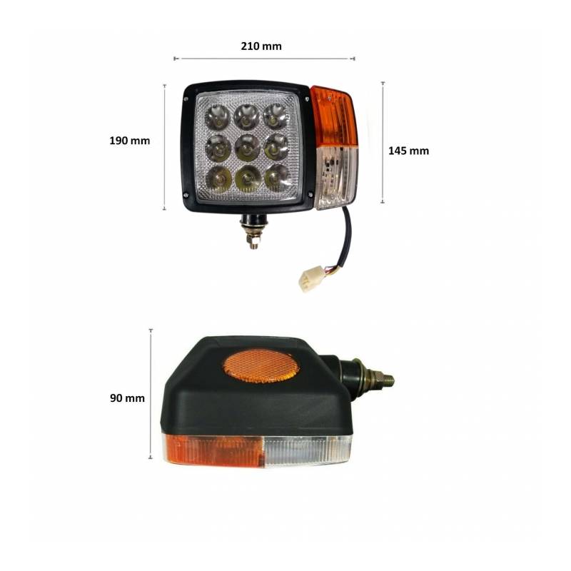 Set 2 proiectoare tractor B1033, 9 LED, 12V-24V, model JCB – proiectoare universale pentru utilaje agricole și utilaje de construcții, cu lumină de lucru alb rece și semnalizare galbenă integrată.